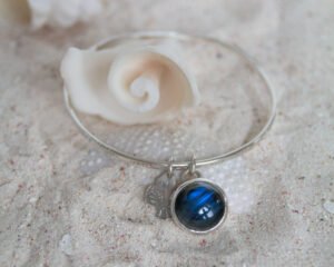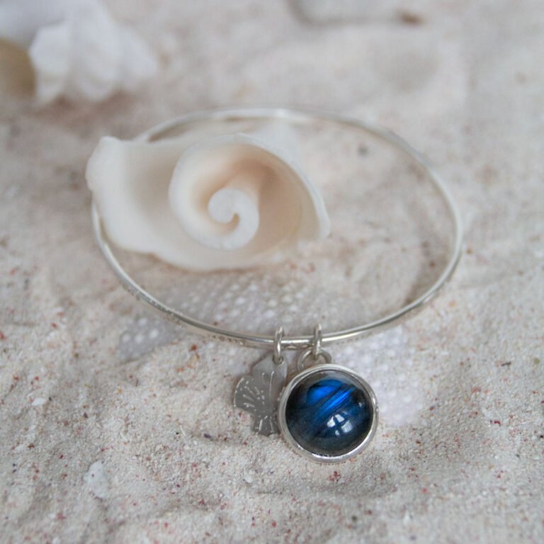På bild ser ett av mina nätta klassiska silverarmband (925), blankpolerat med mönster. Dekorerat med ett silverhänge i form av en fjäril och en vackert djupblå labradorit.